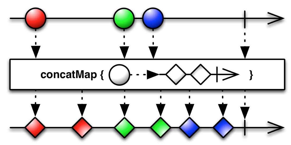 concatMap()은 flatMap과 유사하지만(이벤트 → 옵저버블) 원래의 옵저버블에서 이벤트가 발행되었을때 이전의 데이터 흐름이 끝나지 않았으면 종료를 기다린다.