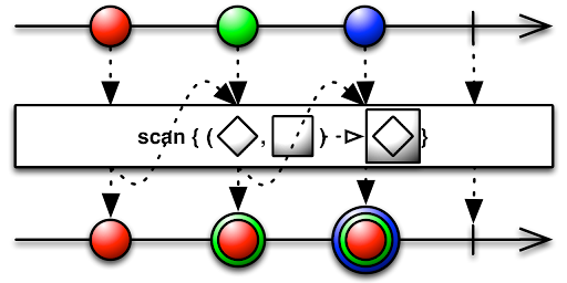 Observable<Int>.from([1,2,3,4,5,6,7,8,9,10]).scan(0) { sum, value in return sum + value}.subscribe(onNext: { value in print(value) // 1, 3, 6, 10, 15 ... 55})